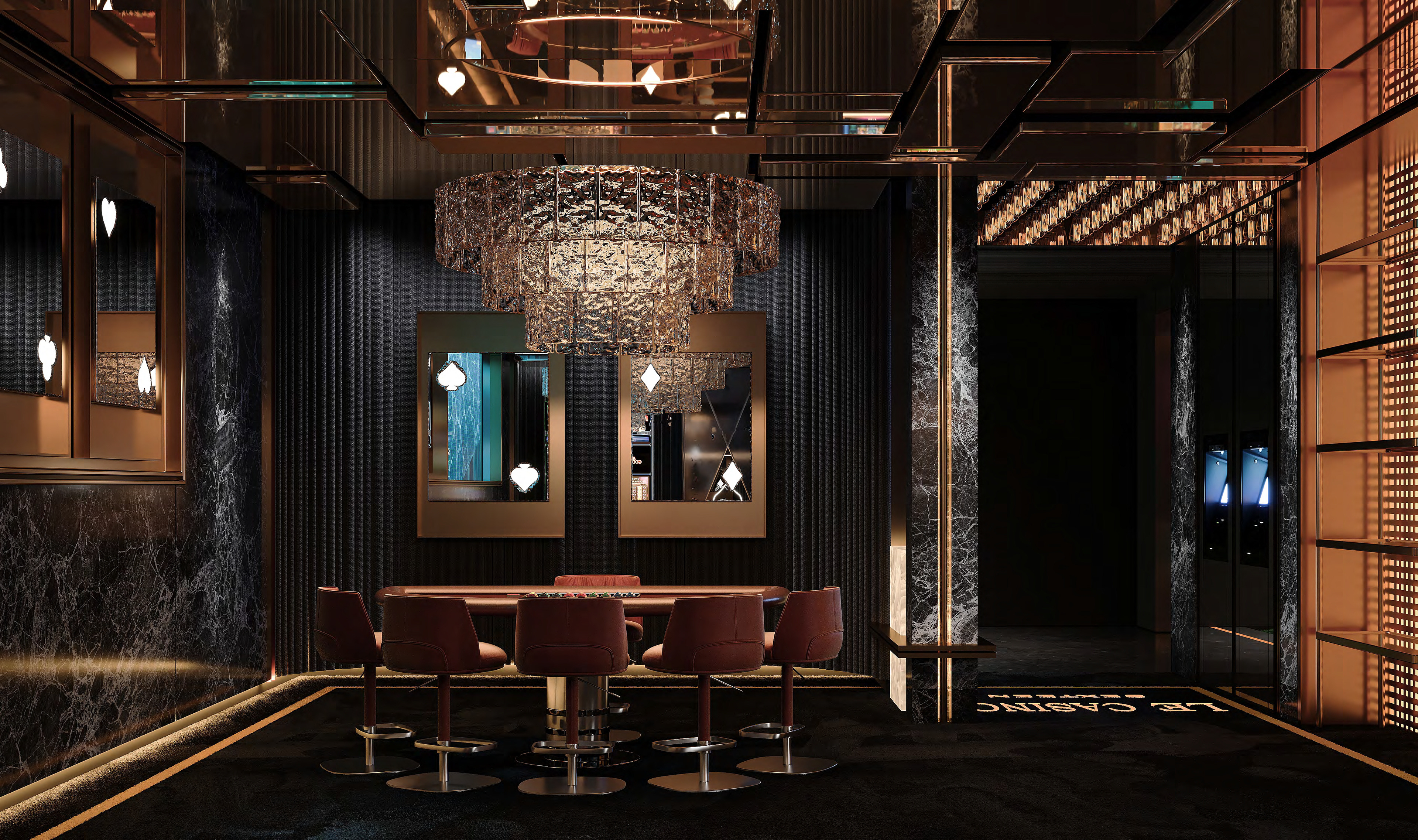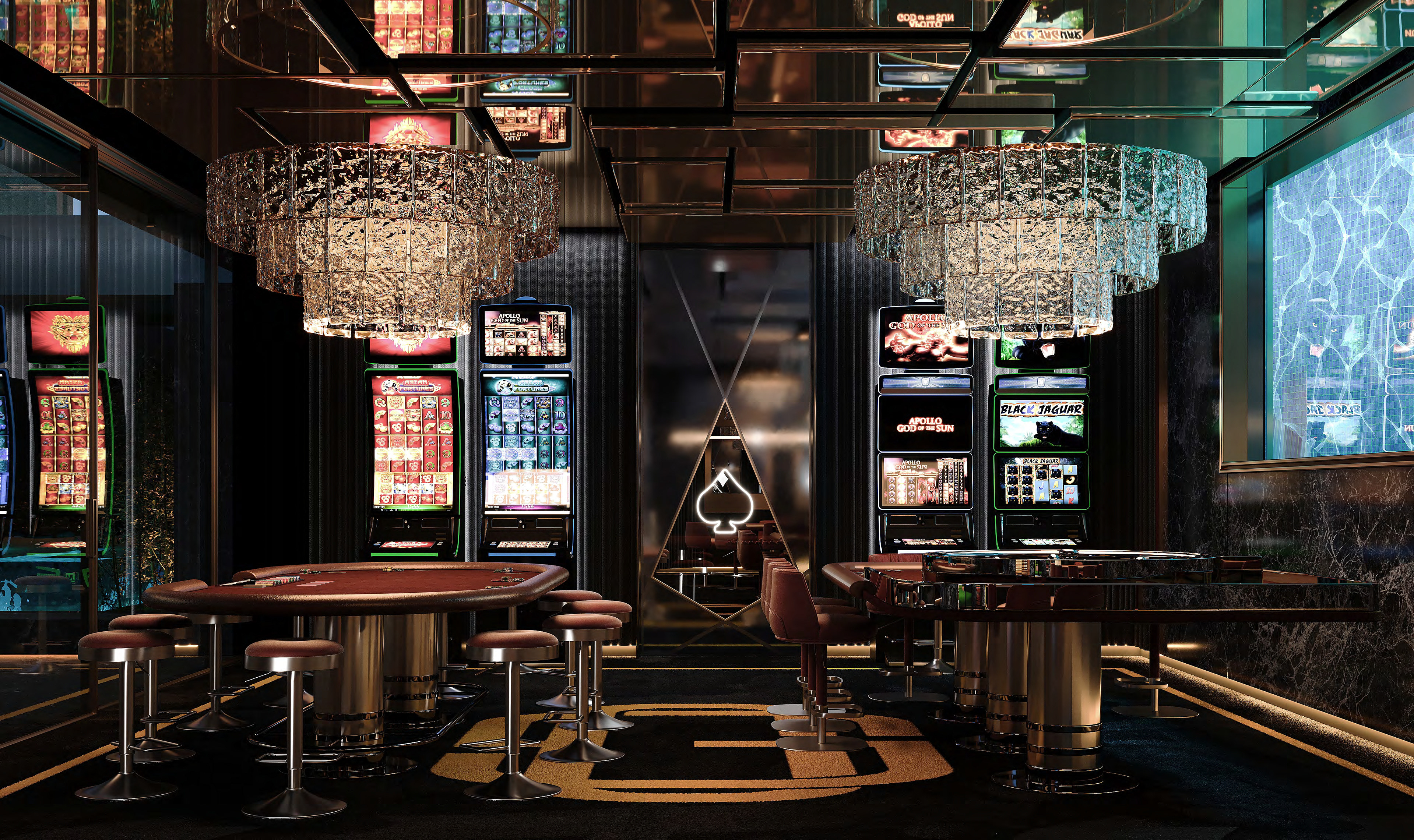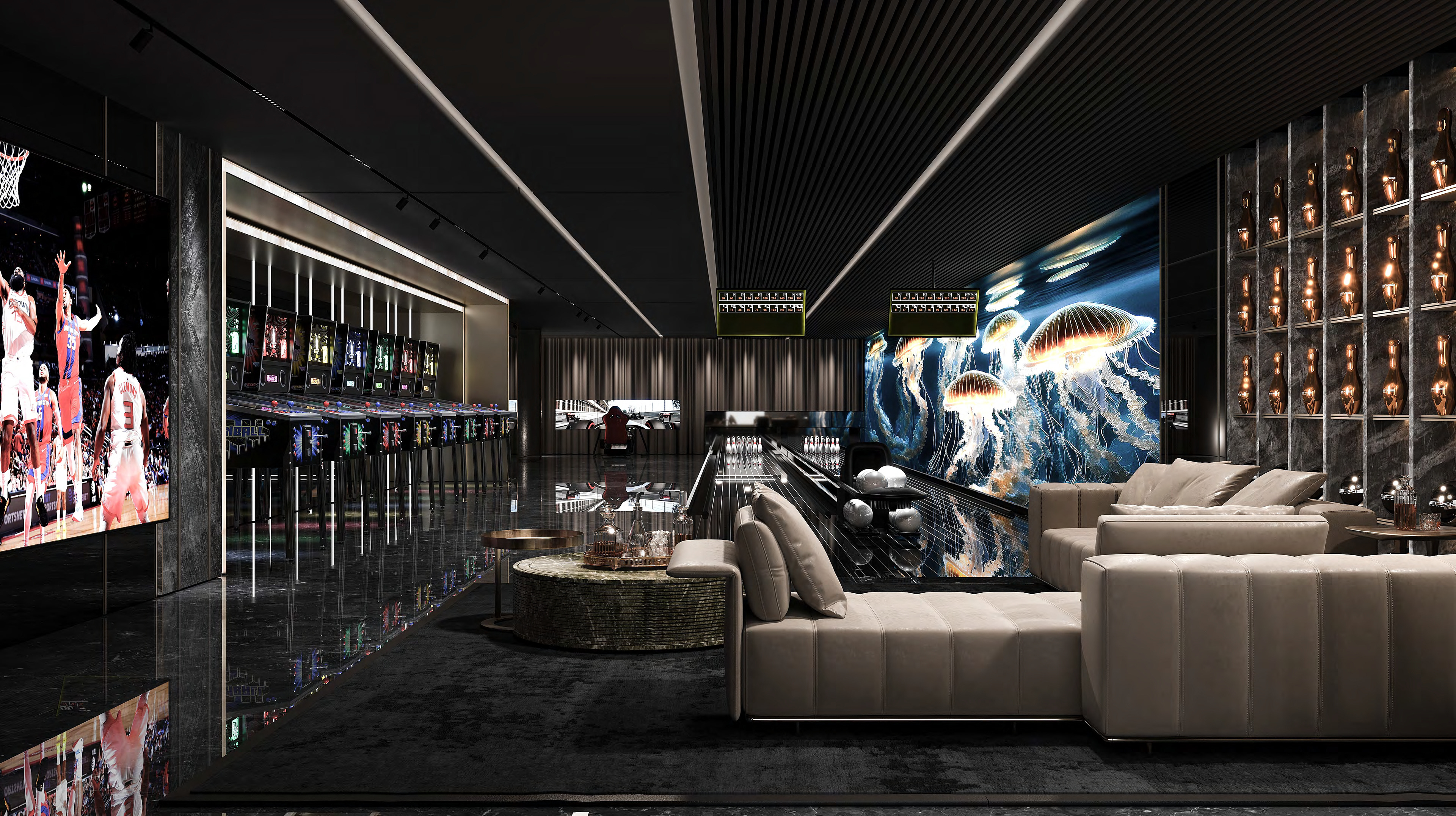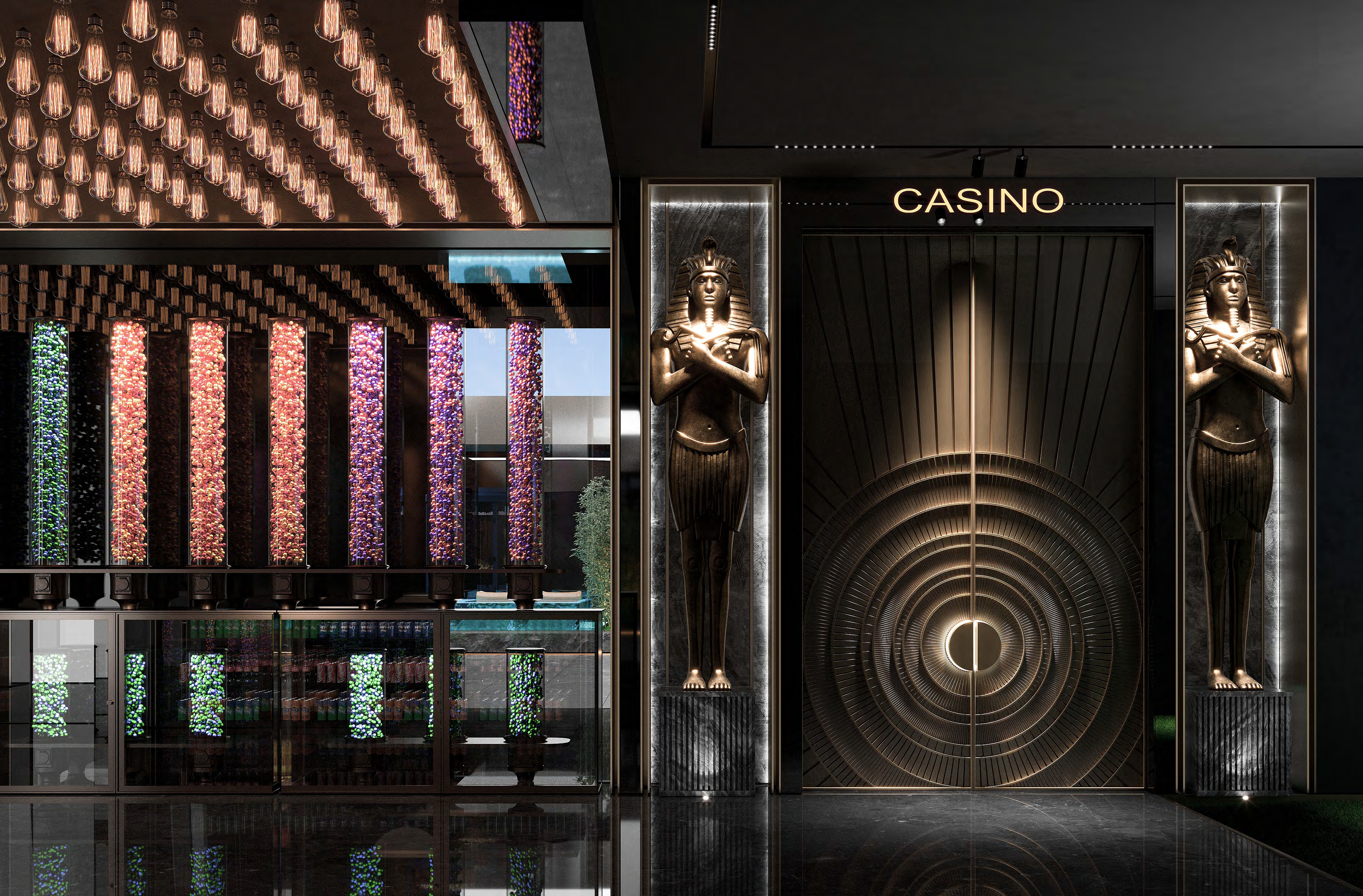 High end design for a casino, bowling alley, golf simulator, bars and bathroom